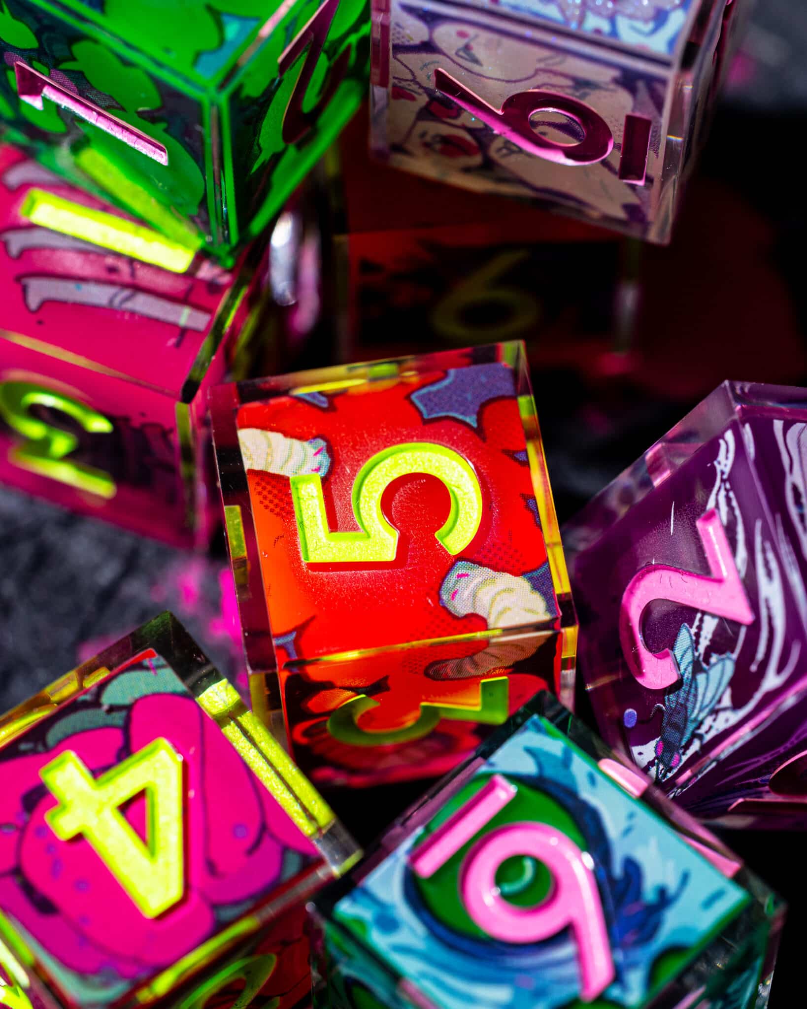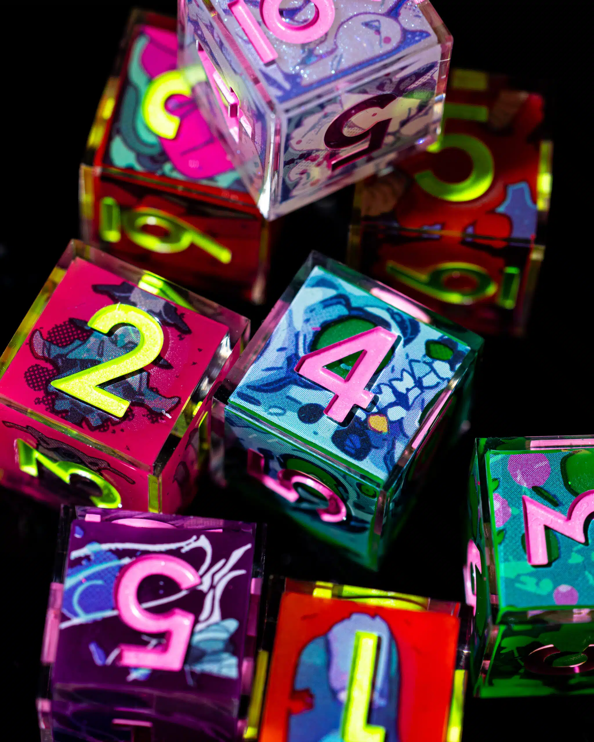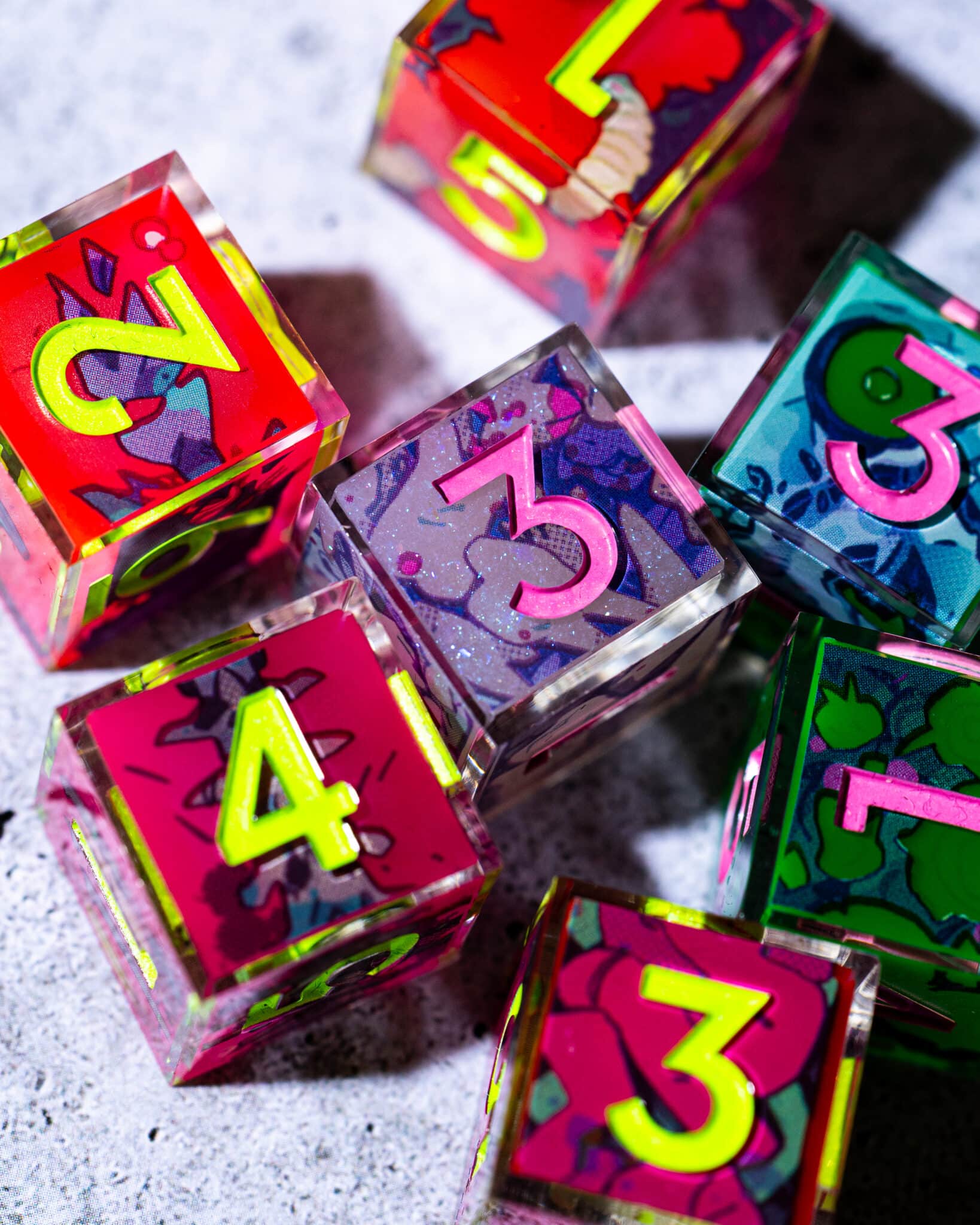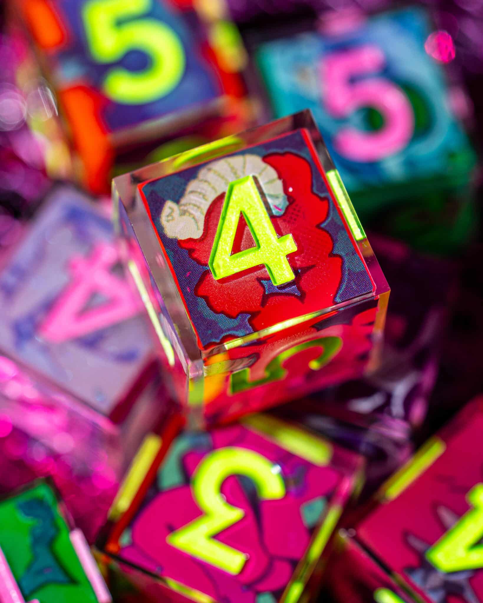 ECTO: The brightest, eye-searingest green we could get contrasted by pink numerics painted over the top. Depicts some kind of gunk: Irynaโs occult runoff? Chuckโs undead snot? Whoโs to say. Much to consider.