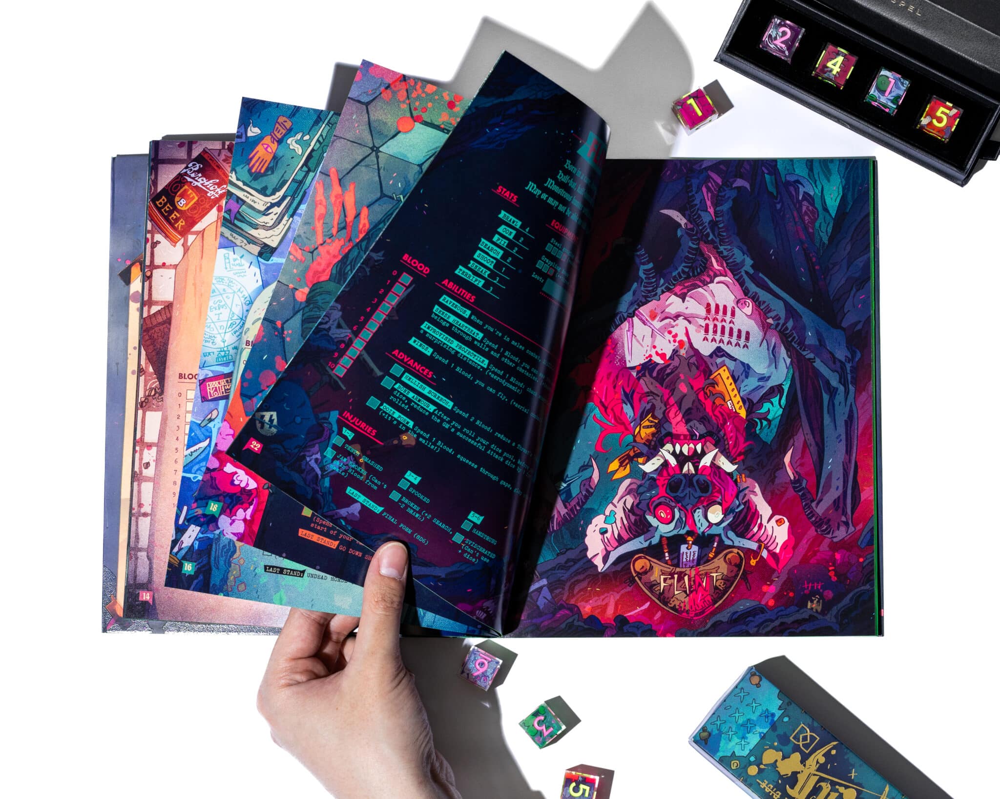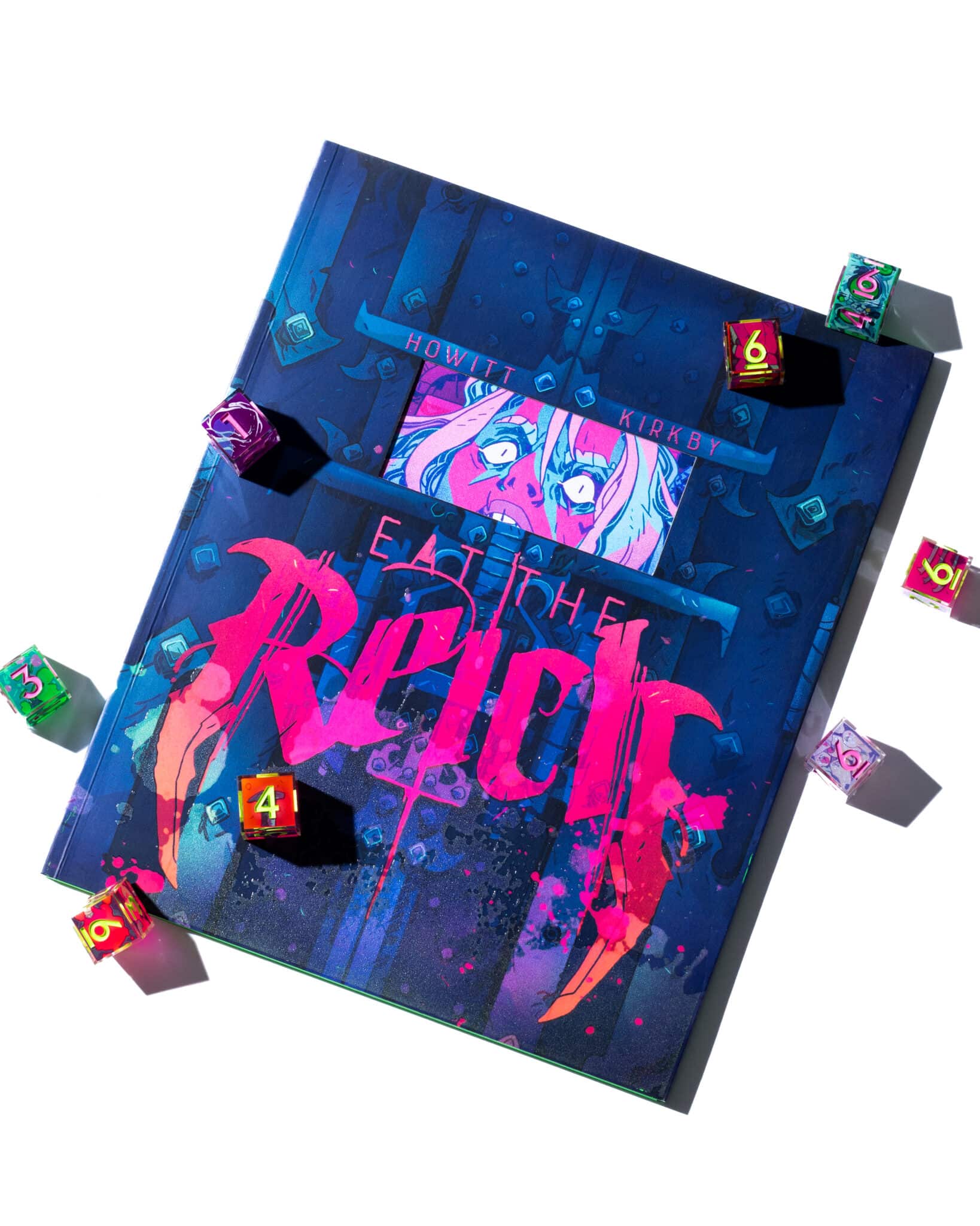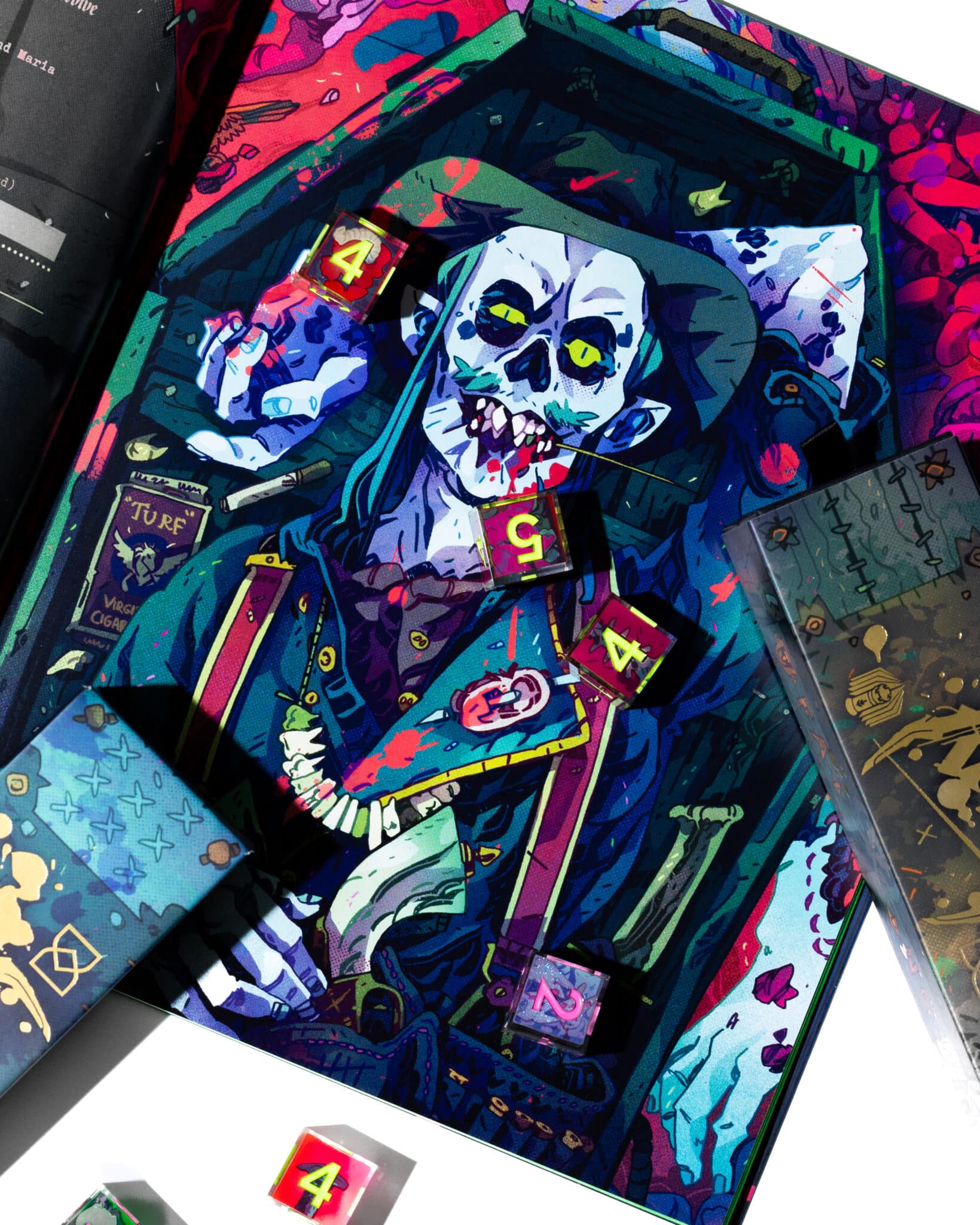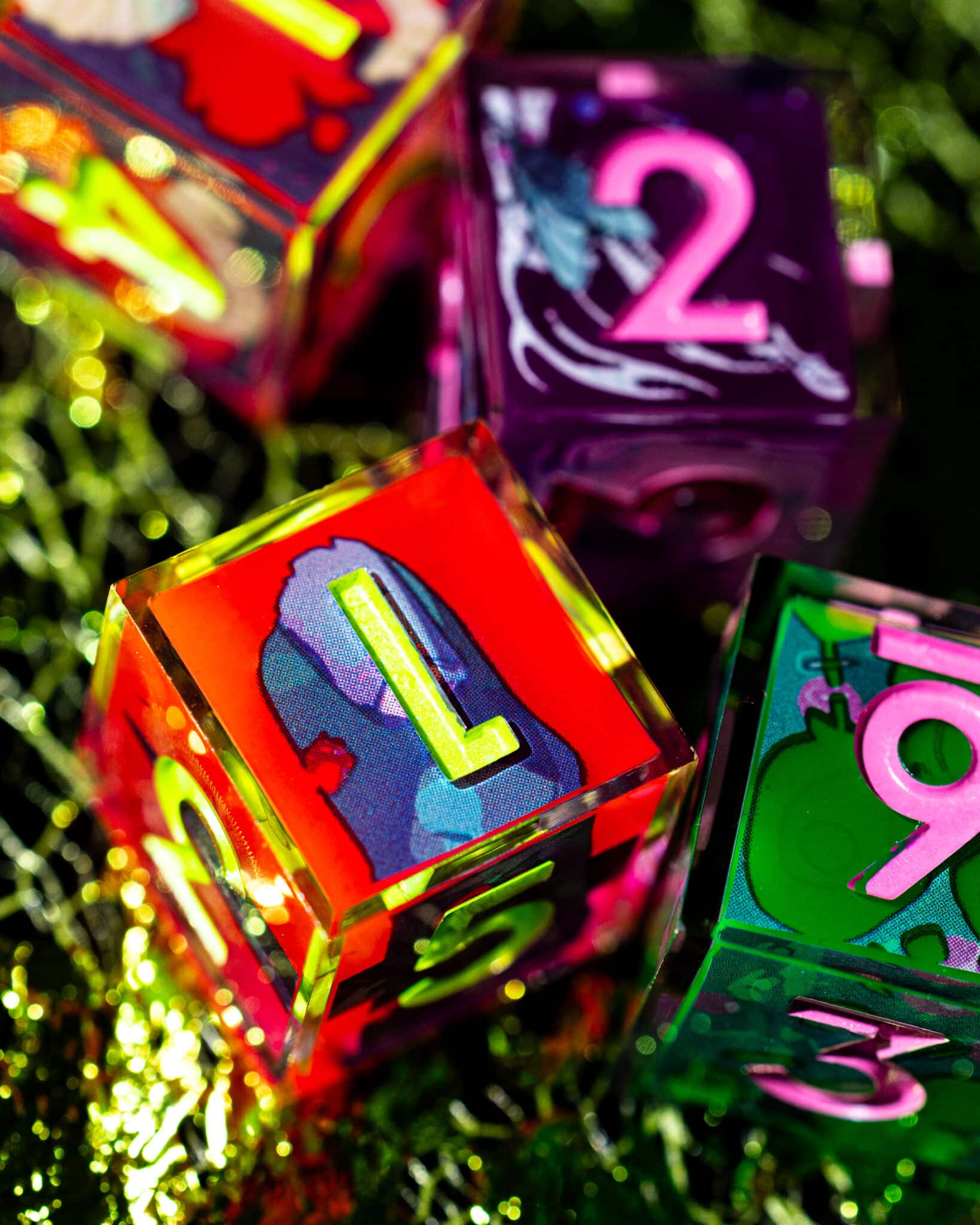 ECTO: The brightest, eye-searingest green we could get contrasted by pink numerics painted over the top. Depicts some kind of gunk: Irynaโs occult runoff? Chuckโs undead snot? Whoโs to say. Much to consider.